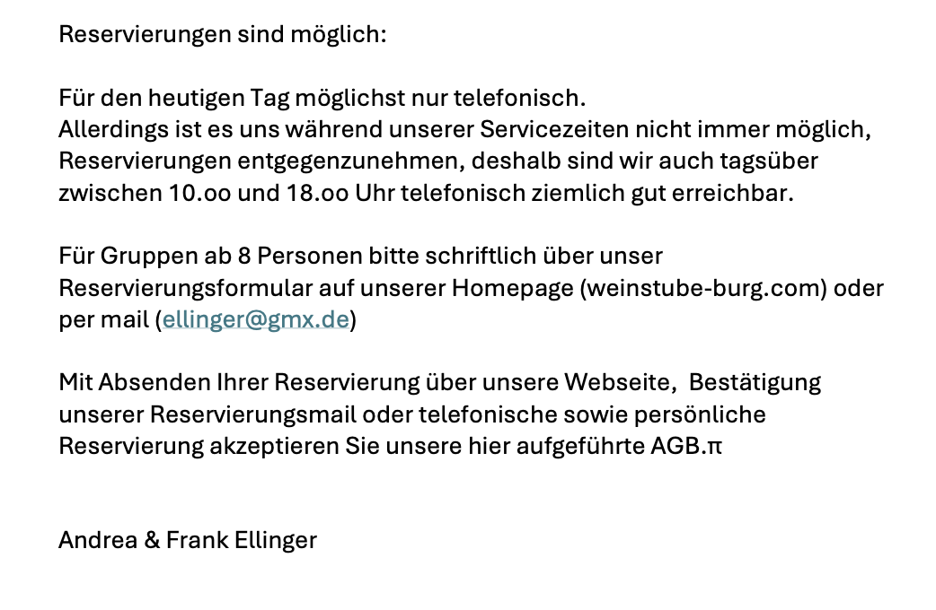 Gerne sind wir für Anfragen und Reservierungen auch tagsüber ab 10 Uhr telefonisch zu erreichen.